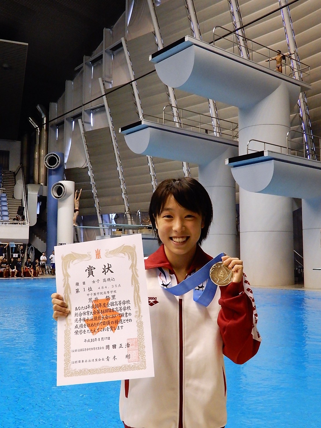 女子高飛込において、本校の荒井祭里さんが見事優勝に輝きました。