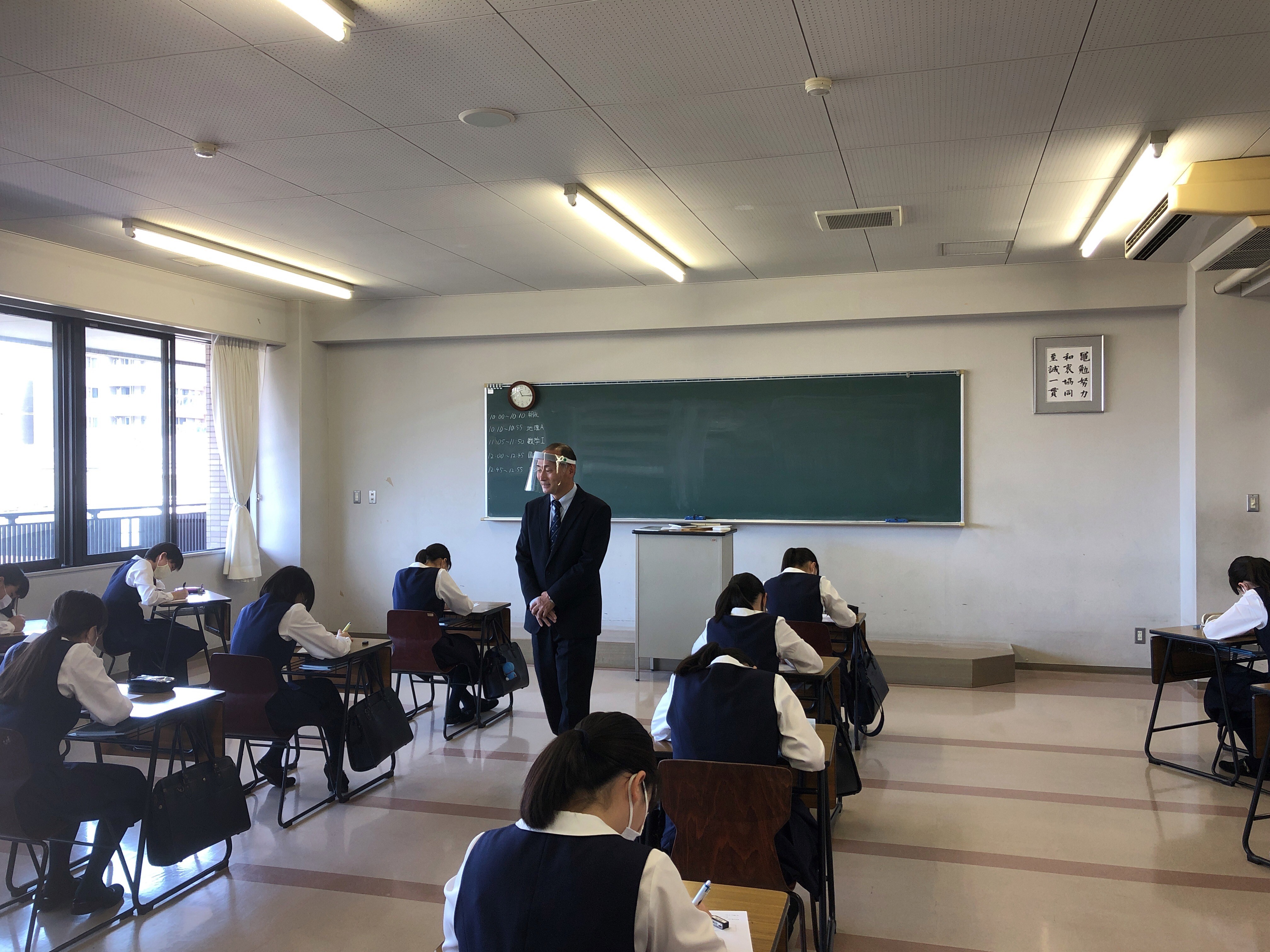 感染予防の観点から机の間隔を広く取り、教員はマスクもしくはフェイスシールドを着用しています。
