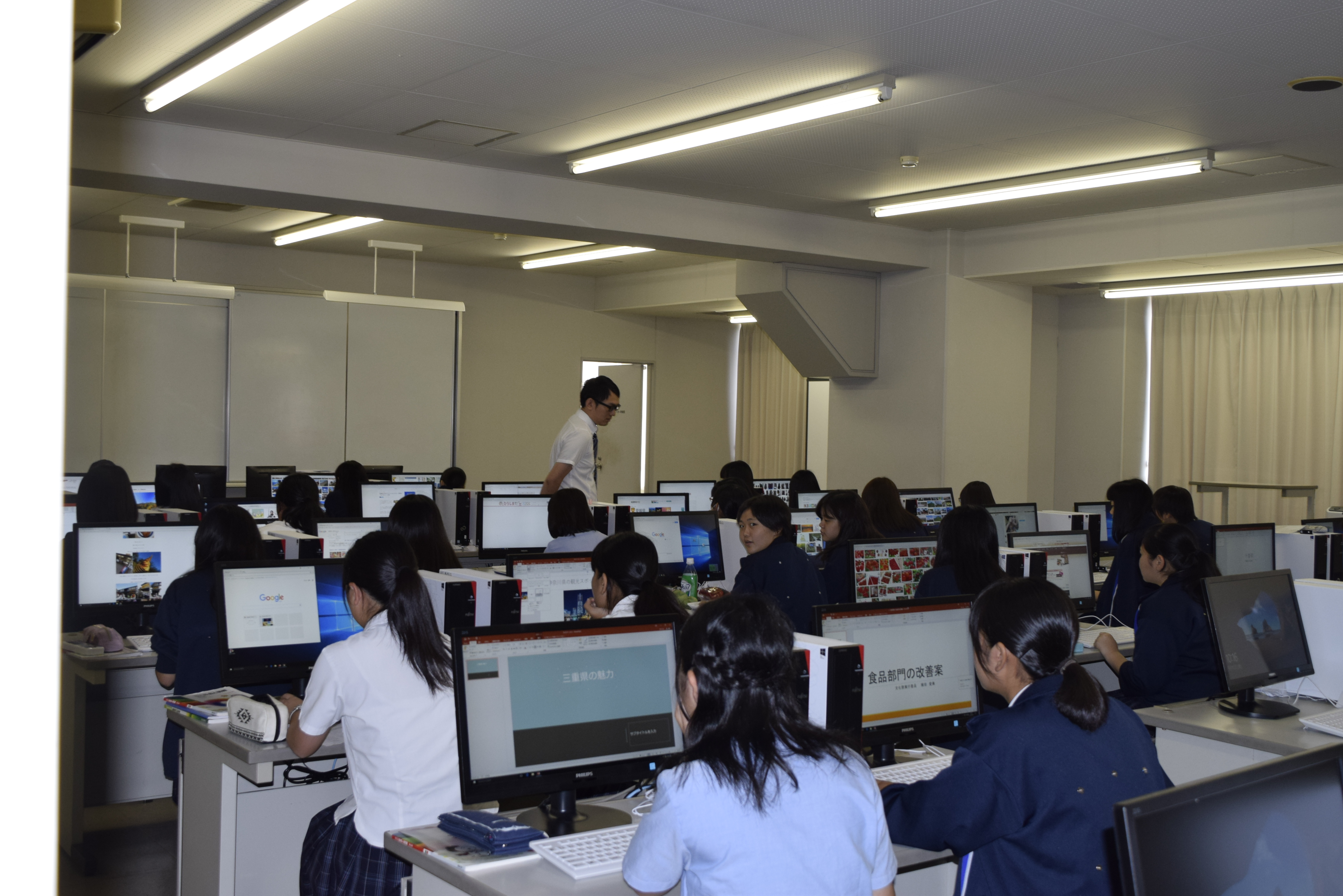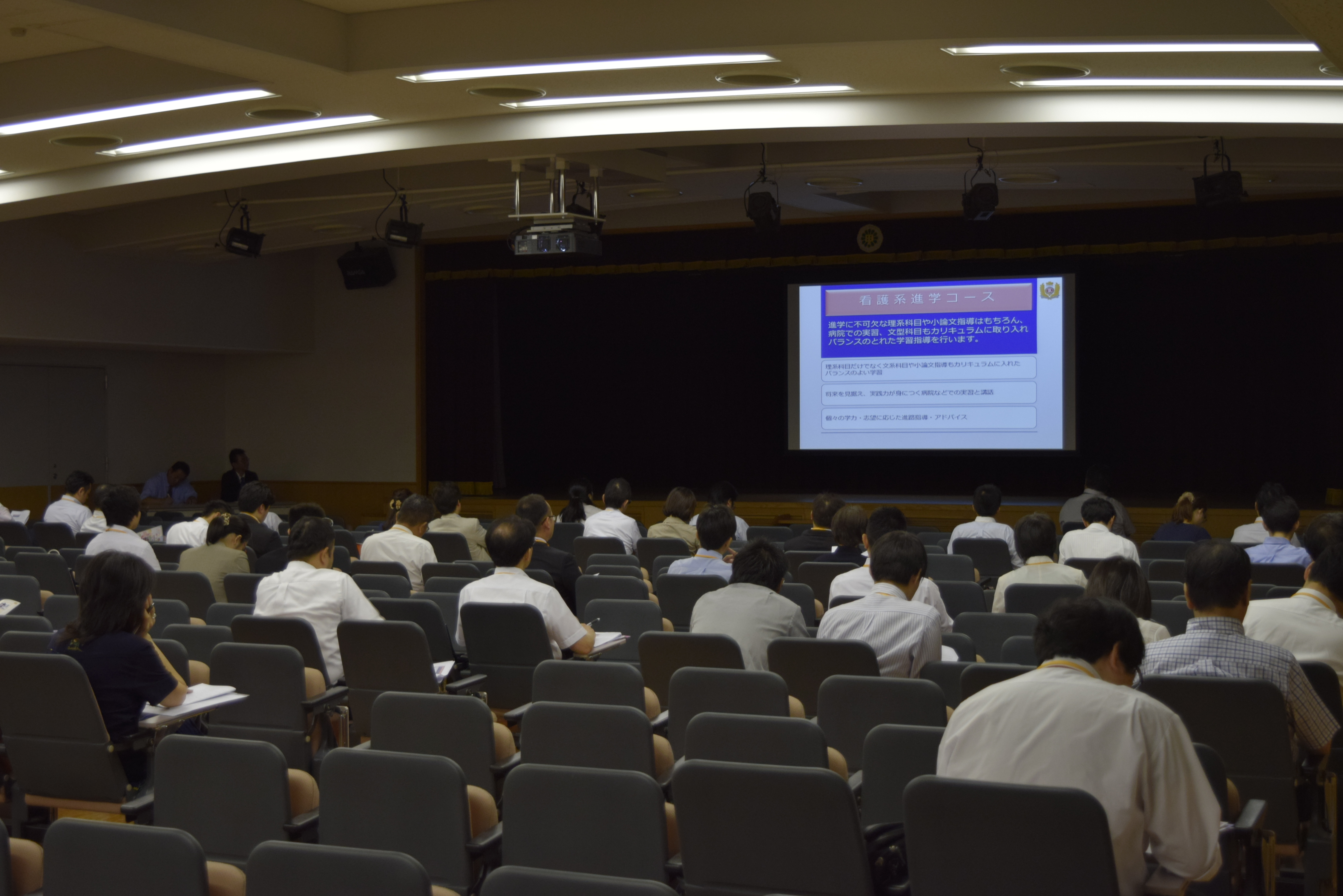 今年度は公開授業の後、講堂にて全体説明会を行い、中学校での取り組みや高等学校6コースに加え、新しく募集する生活デザインコース、入試の概要についてお話をさせていただきました。