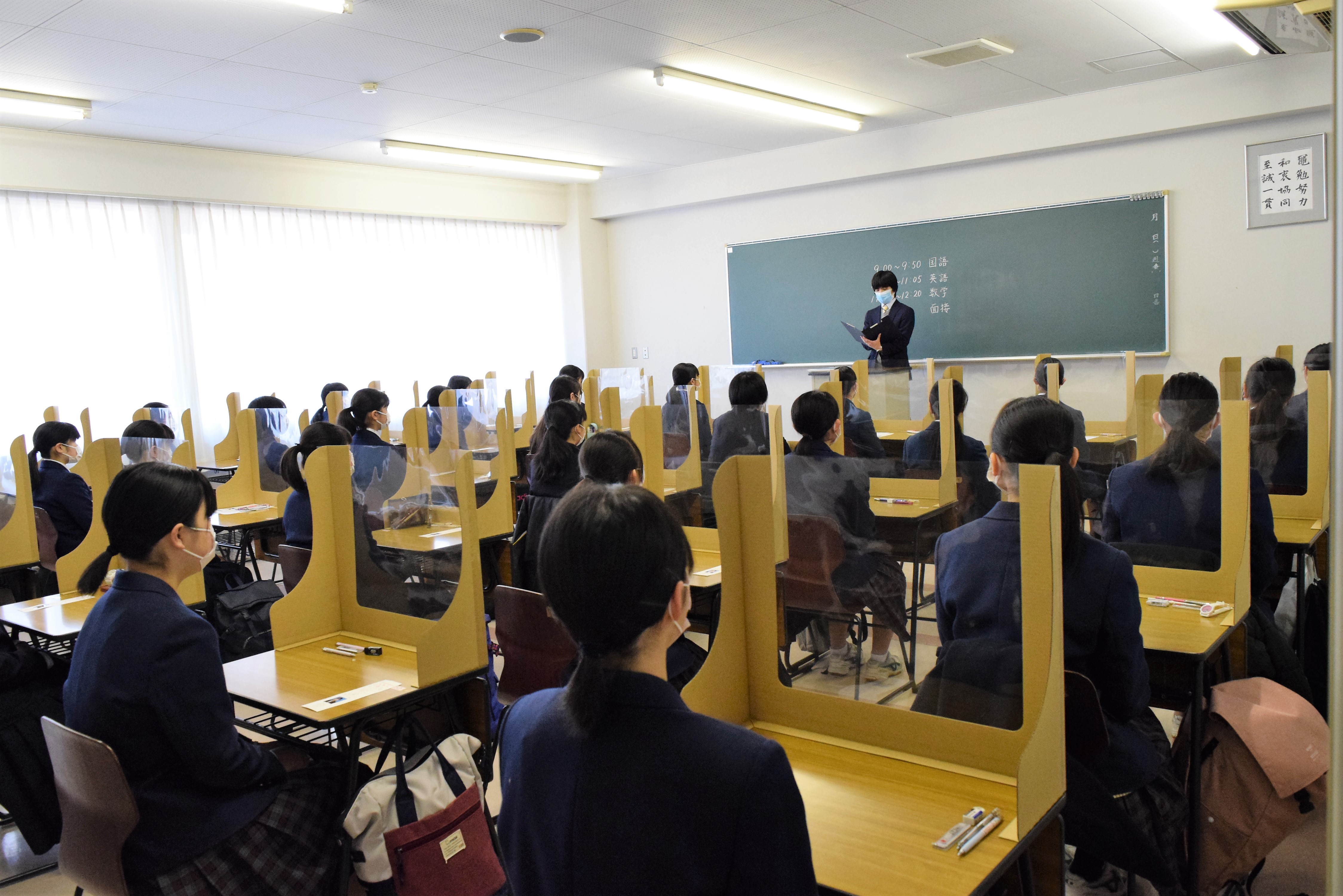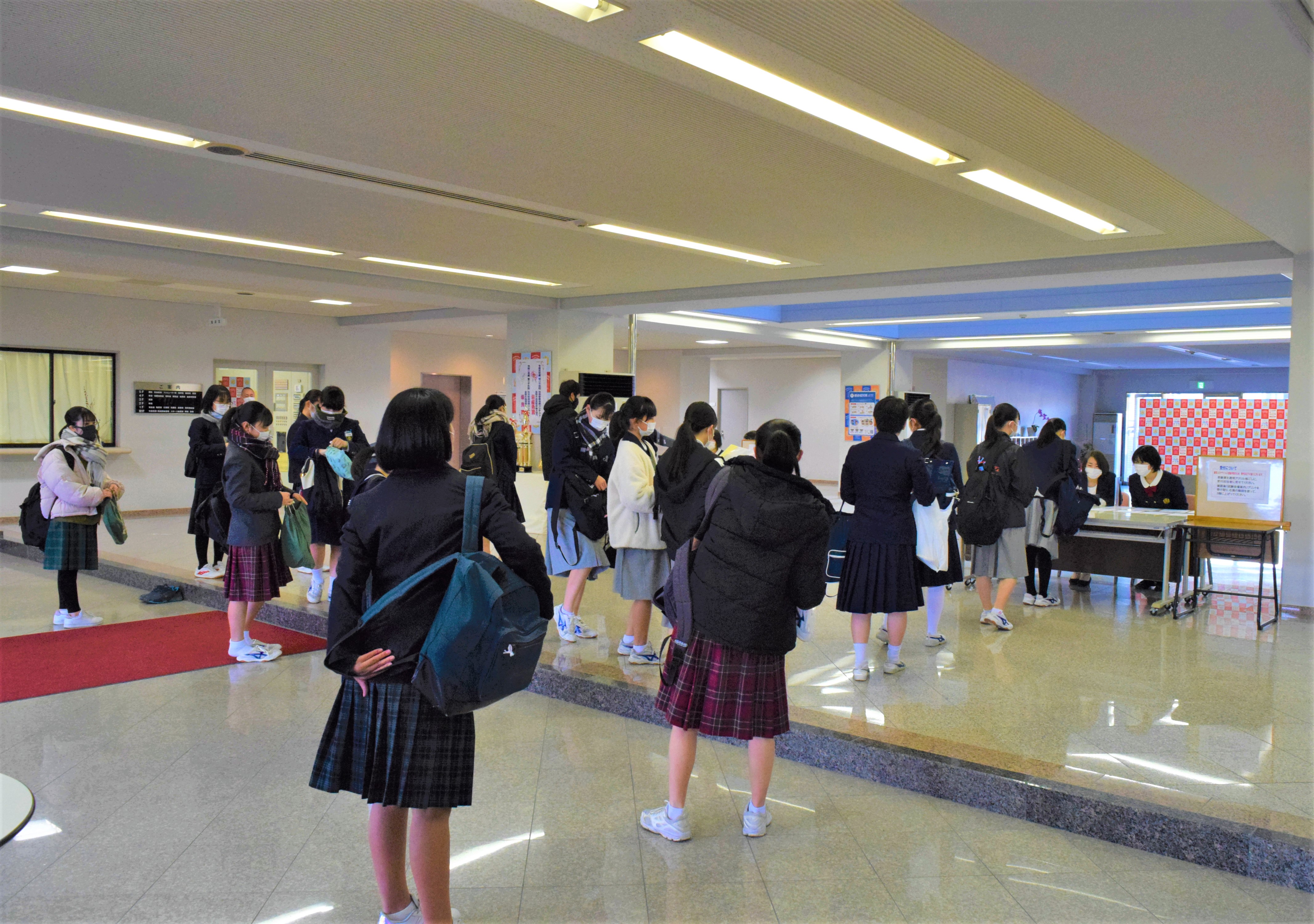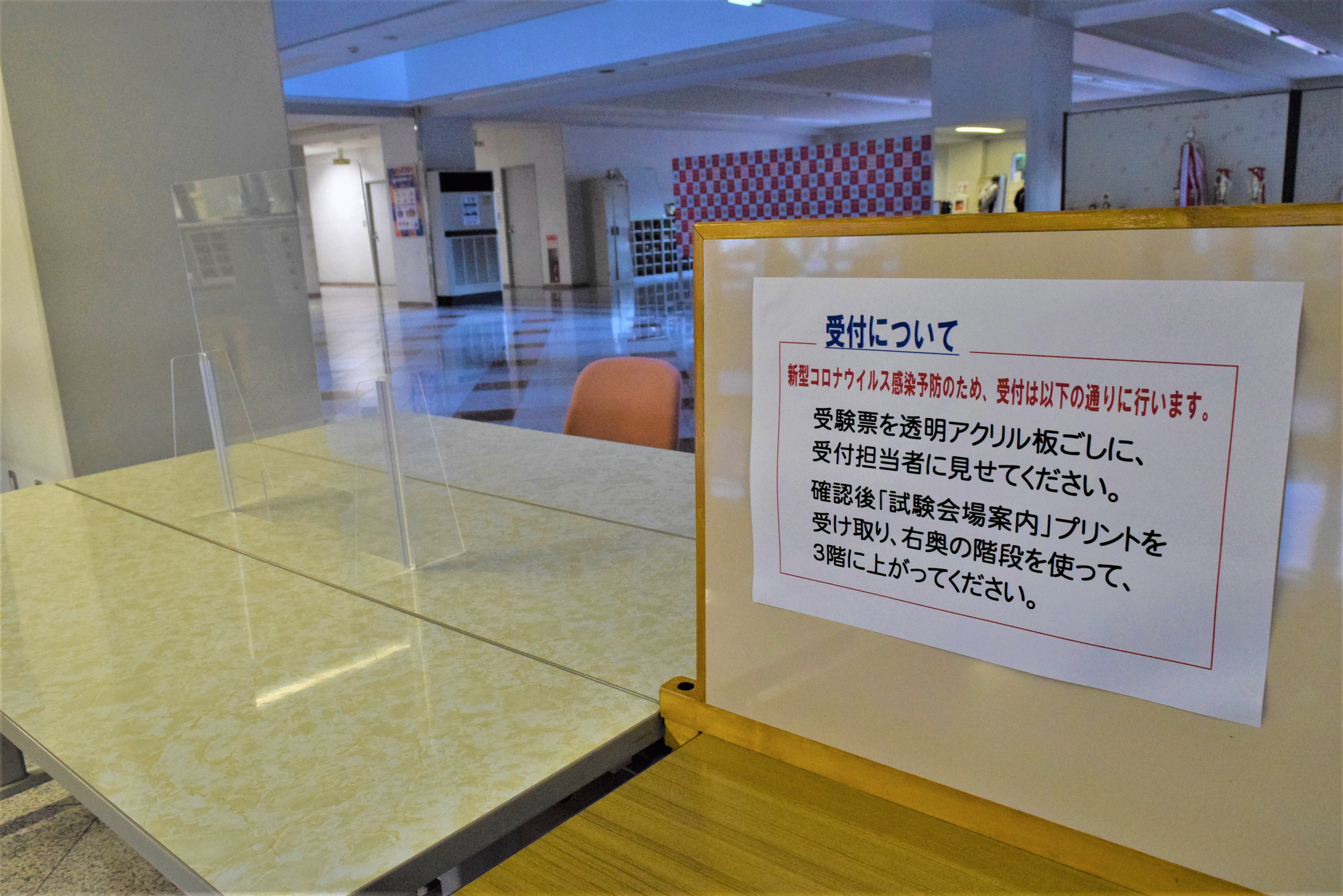 新型コロナウイルス感染予防対策を講じながらの入試となりましたが、開門前から受験生が緊張した面持ちで登校し、試験会場に入ってからも参考書やプリントに目を通したりしながら、それぞれ思い思いの時間を過ごしていました。