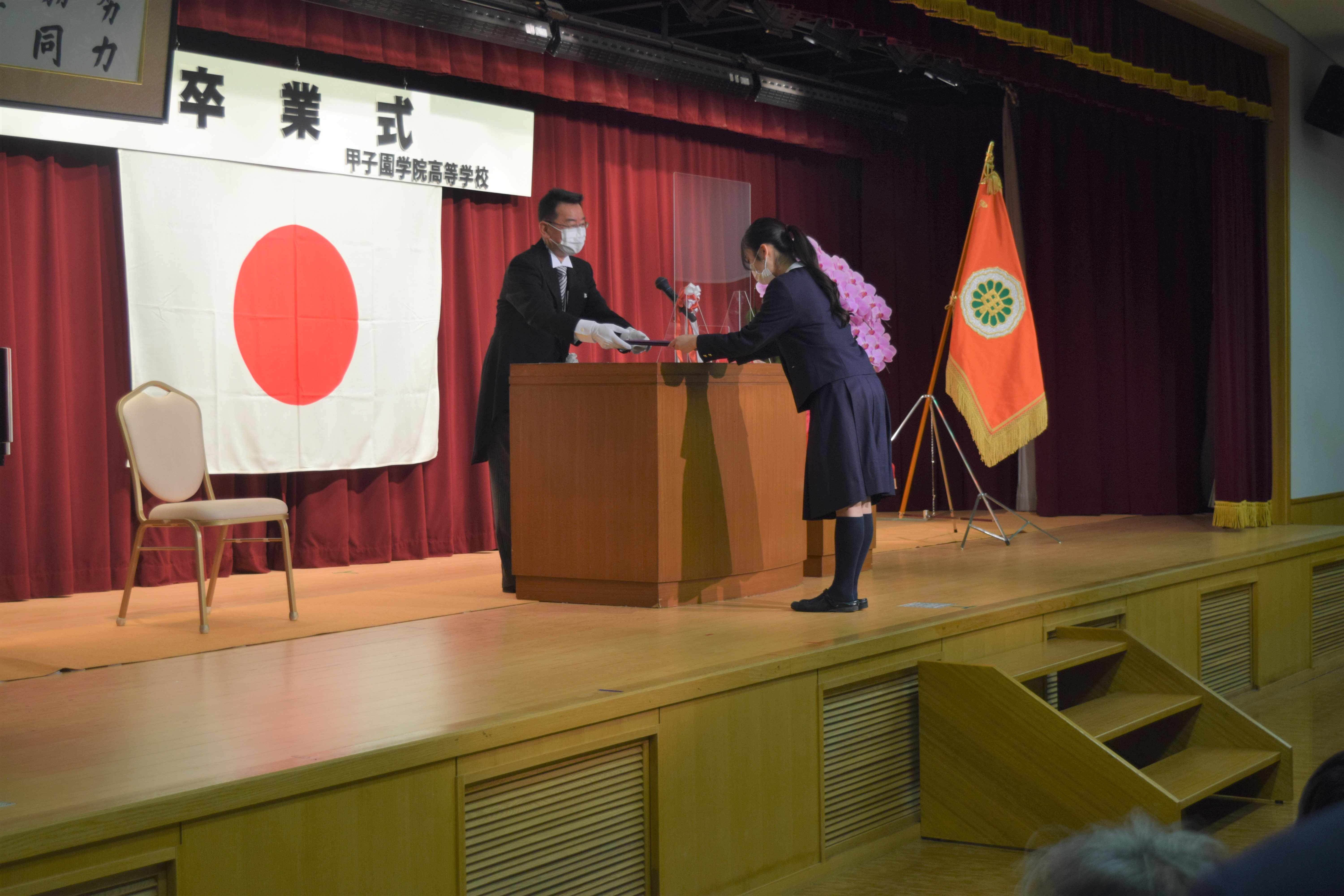 式では、新型コロナウィルス感染症対策を講じた上で、卒業証書授与をはじめ、3か年皆勤、精勤生徒への表彰ならびに記念品が贈呈されました。