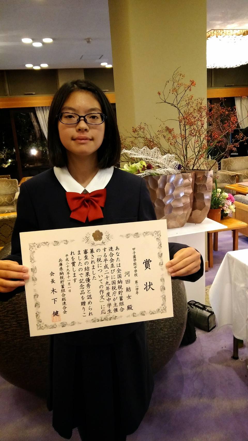 「税についての作文」で入賞しました。 [投稿日:2017年11月15日] 平成29年度中学生の「税についての作文」において、本校中学校第2学年 河田 結女さんが兵庫県納税貯蓄組合総連合会会長賞を受賞し、西宮神社会館にて表彰式が行われました。 一覧へ戻る