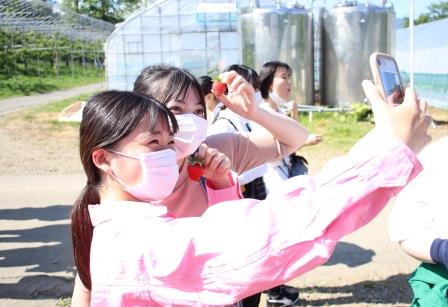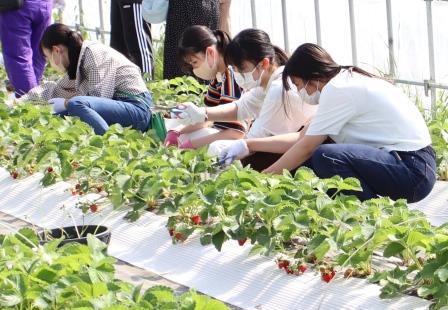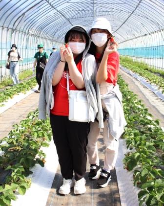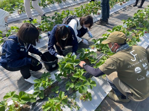 農業体験では「ケンタロウ」という品種のイチゴの手入れのお手伝いをし、最後はご褒美にとれたての一粒をいただきました。