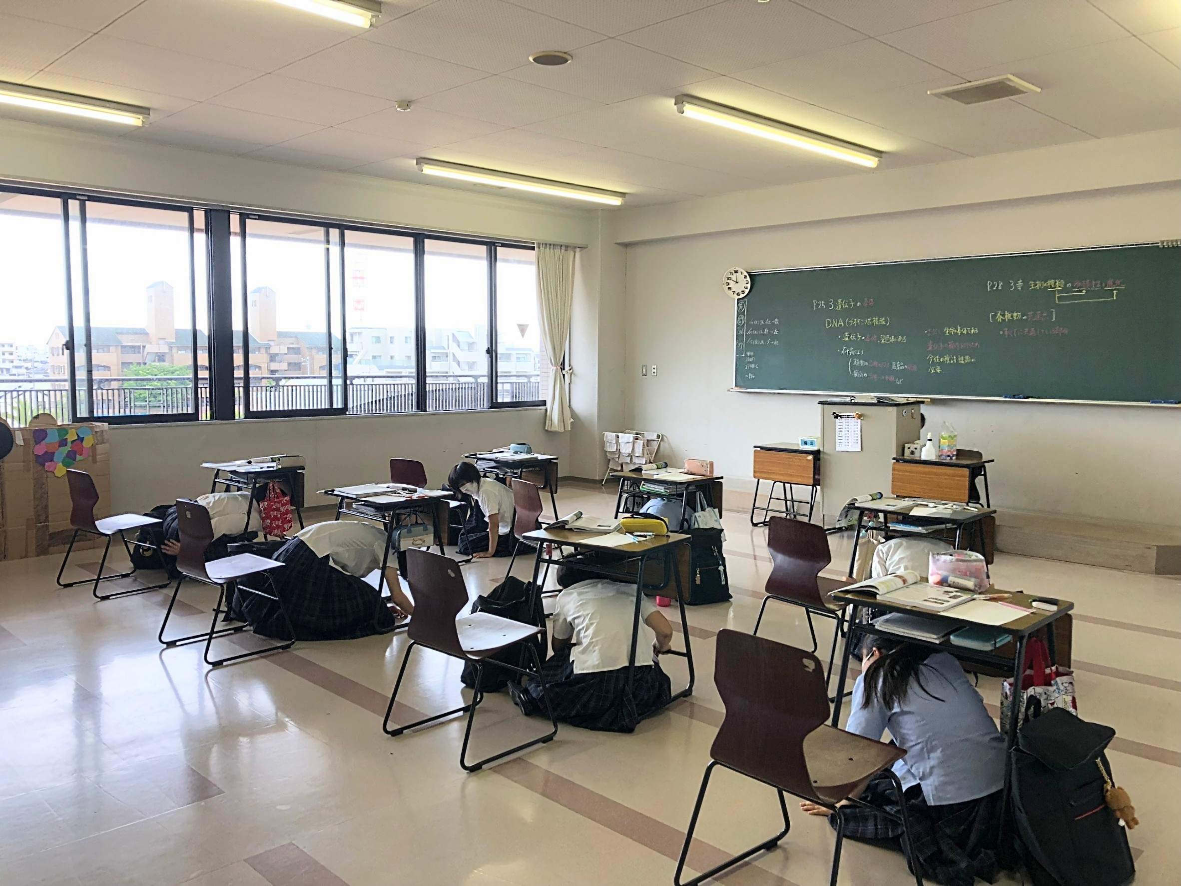 生徒たちは、防災スピーカー等の地震訓練放送に従って、机の下にもぐり頭部を守る姿勢を取りました。