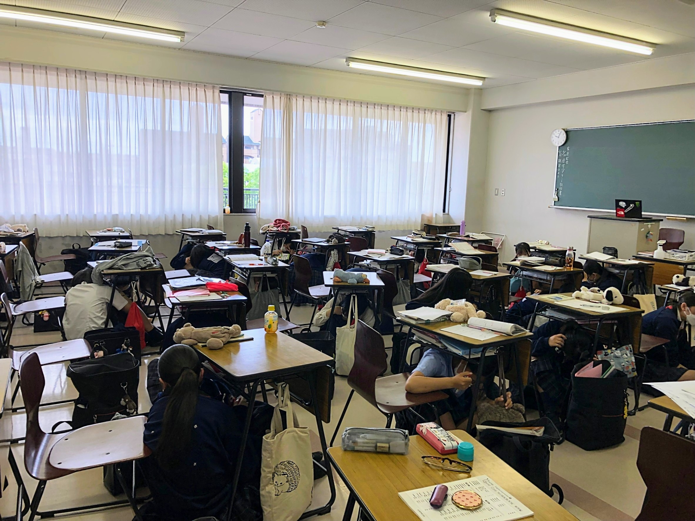6月15日(水)、「緊急地震速報訓練」が全国一斉に実施されるのに合わせて、西宮市では南海トラフ巨大地震に備えた訓練が行われ、本校もシェイクアウト訓練(安全確保行動)に参加しました。
