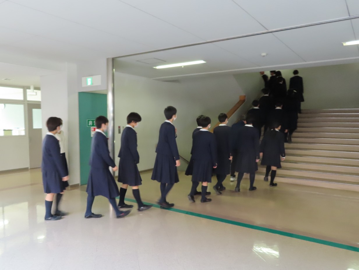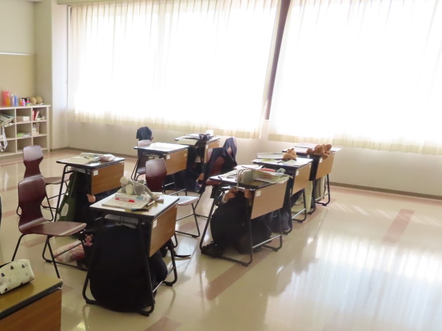 生徒たちは、防災スピーカー等の地震訓練放送に従って、机の下にもぐり頭部を守る姿勢を取り、高いところへの避難を行いました。