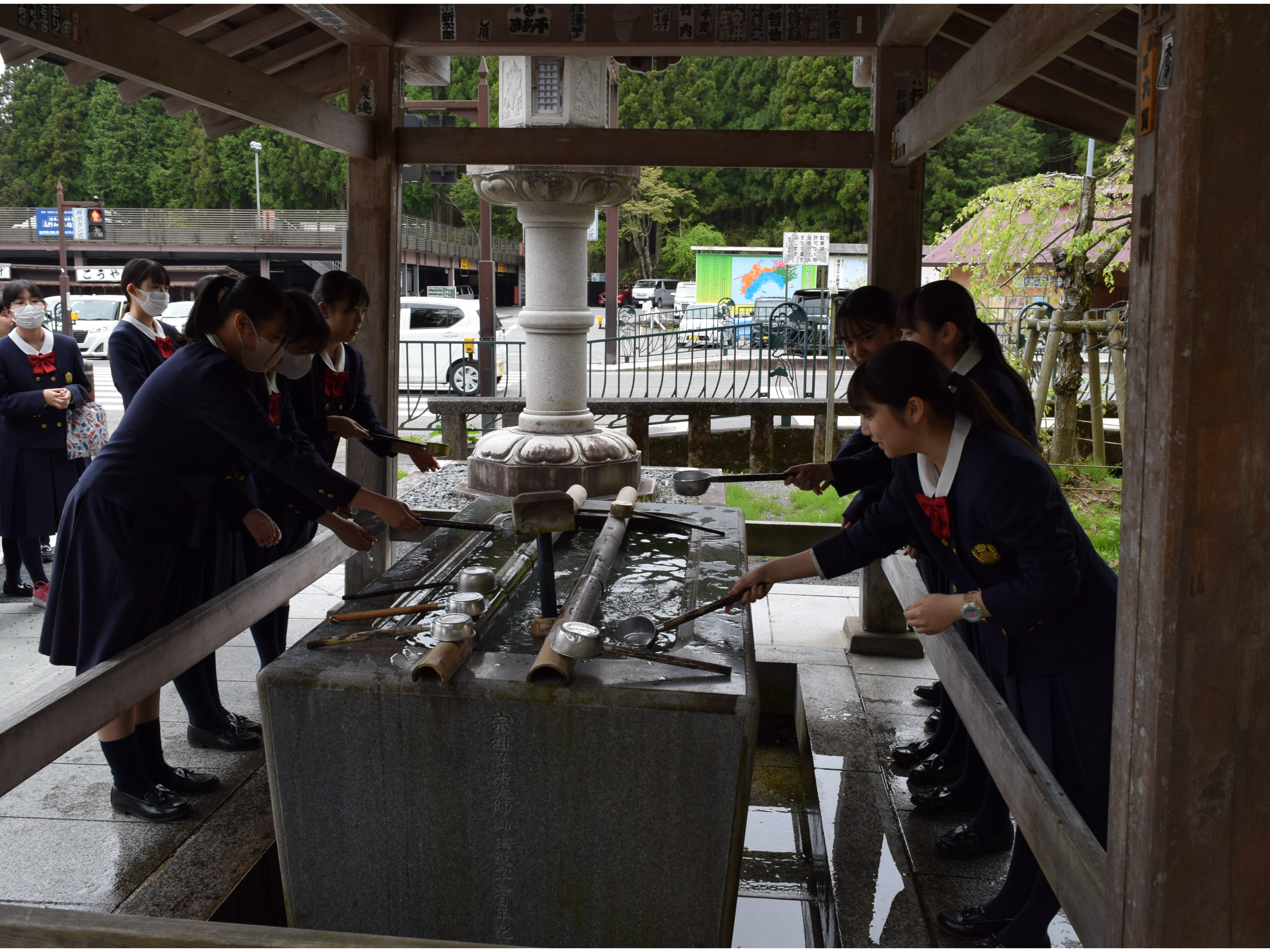 午前8時15分に集合し、貸切バスで高野山へ向かいました。 慰霊塔での参拝は、学院関係者の遺徳を偲び、