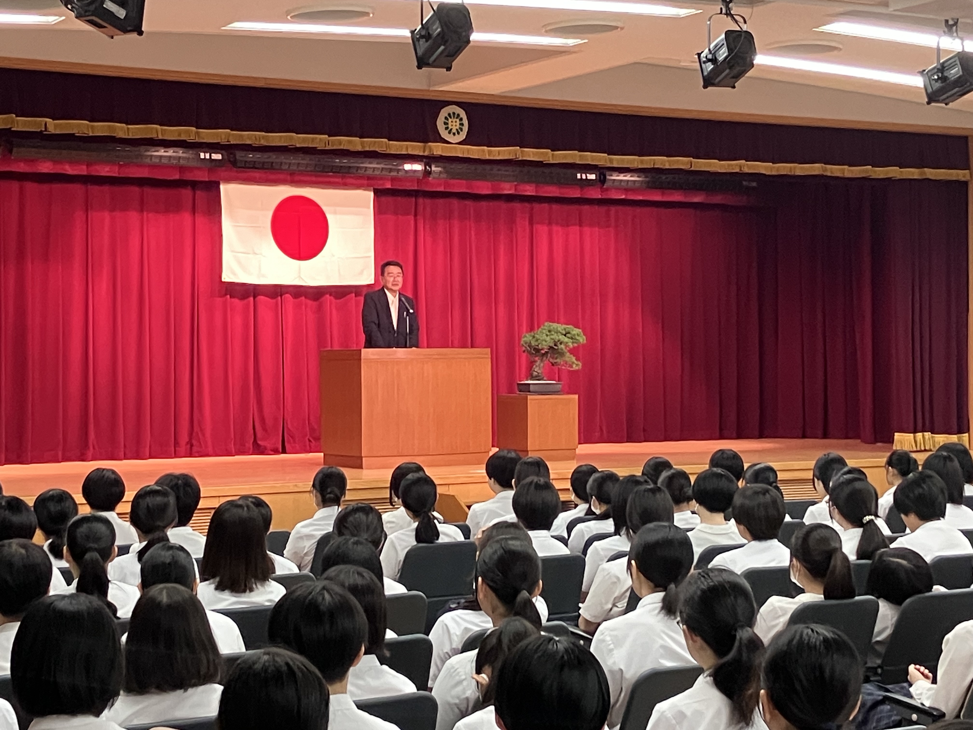 終業式では宮島校長先生からのお話を聞き、吹奏楽部の演奏による国歌ならびに学院歌斉唱を行いました。