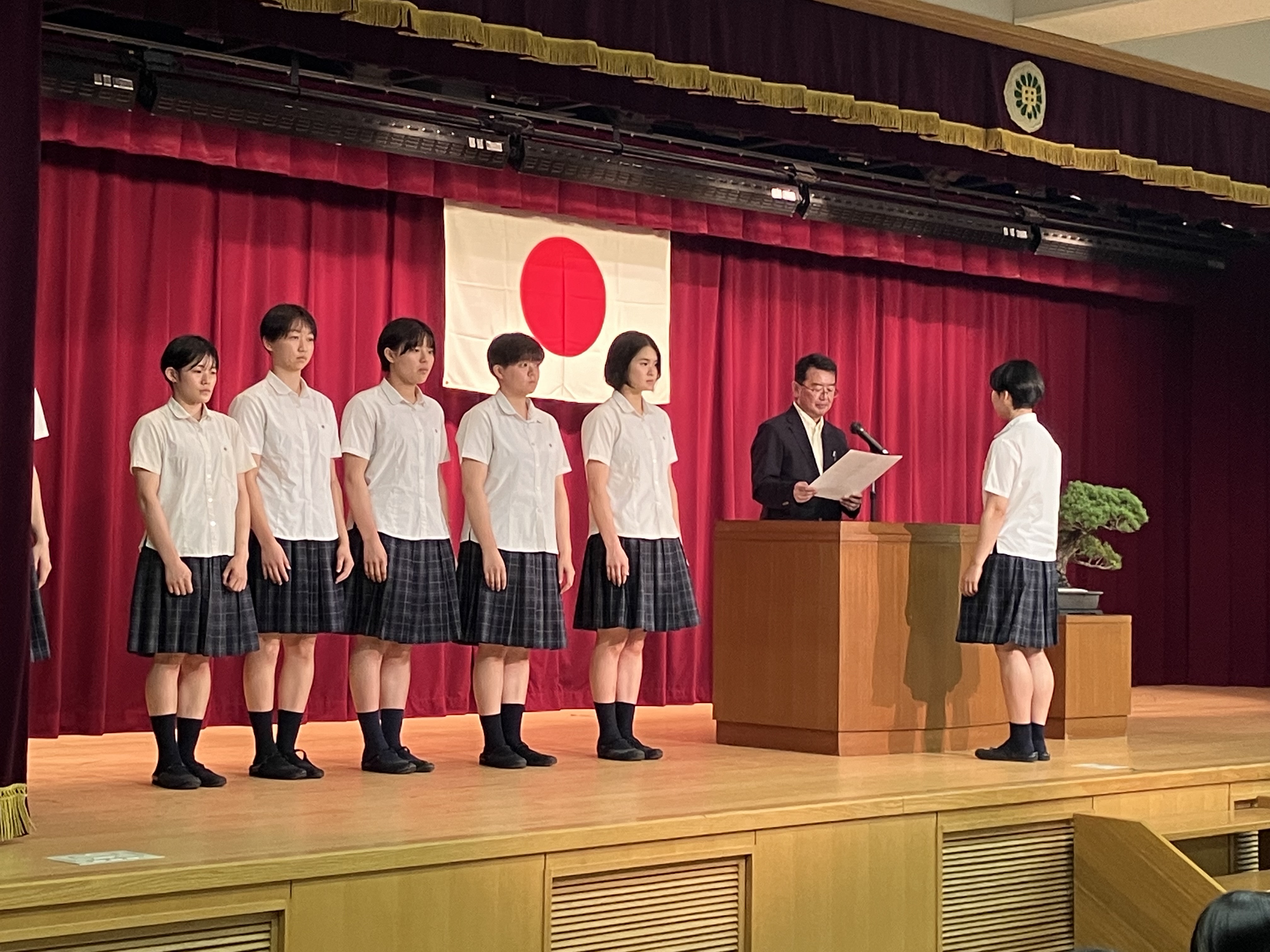 また、各部活動の表彰伝達があり、中学校・高等学校剣道部、中学校・高等学校バレーボール部、高等学校体操部等の表彰があり、校長先生より賞状が授与されました。