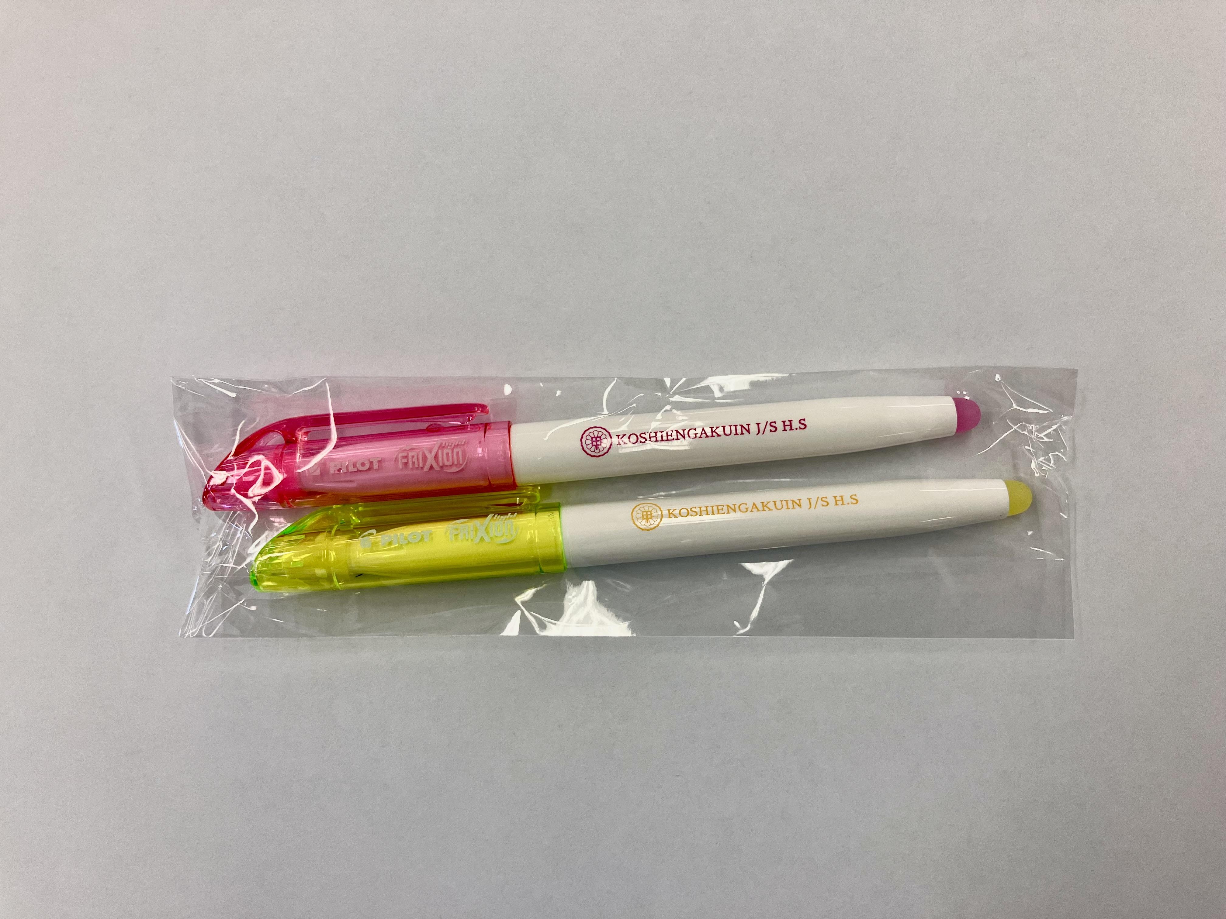 ノベルティグッズは付箋ではなく、今回からは蛍光ペンをプレゼントしております。黄色と赤色の2色で、フリクションのため使いやすいものとなっています。