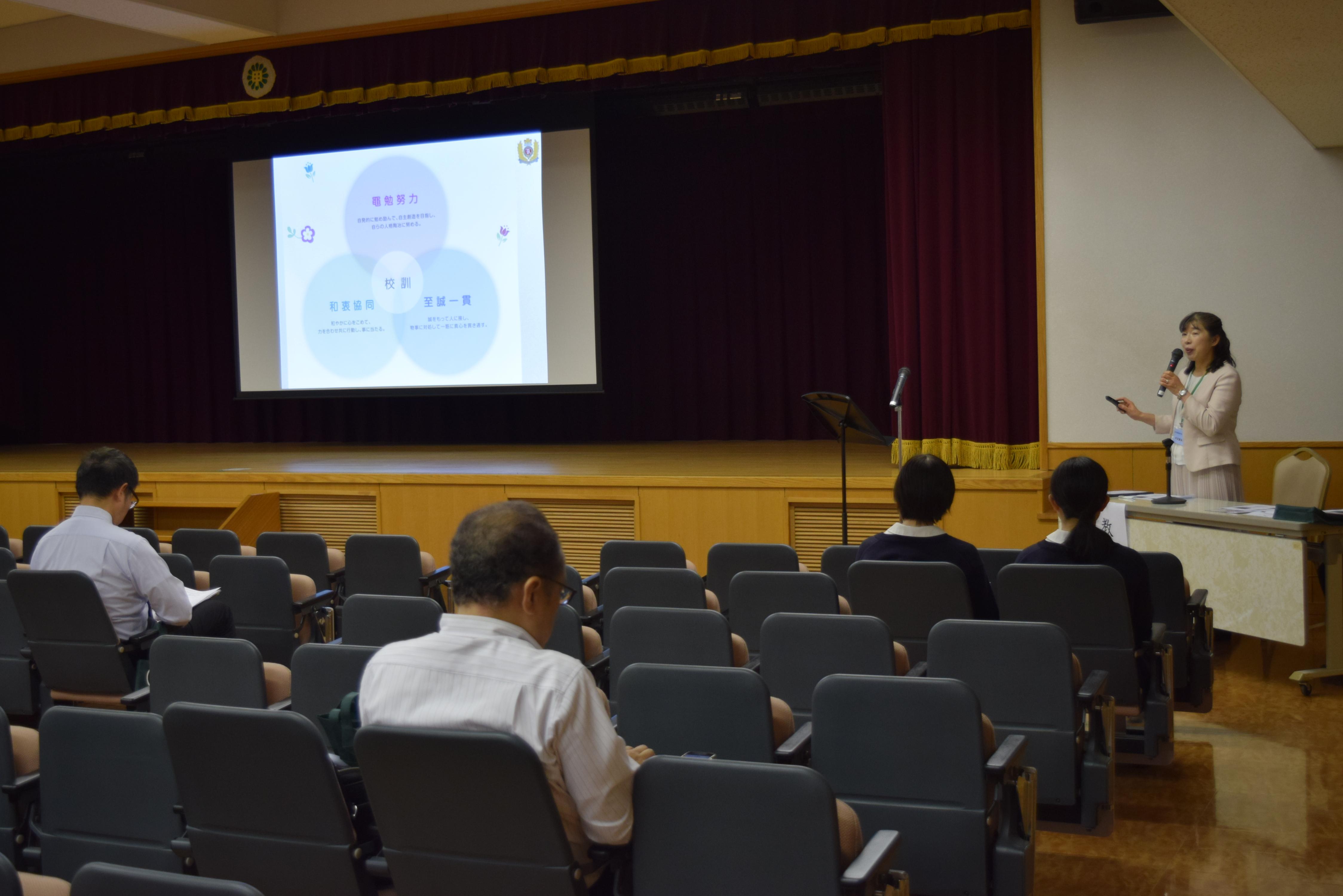 初めに、吹奏楽部の歓迎演奏をお聴きいただいた後、中学校での取り組みや高等学校のコース制、2025年(令和7年)度入試の概要について説明いたしました。