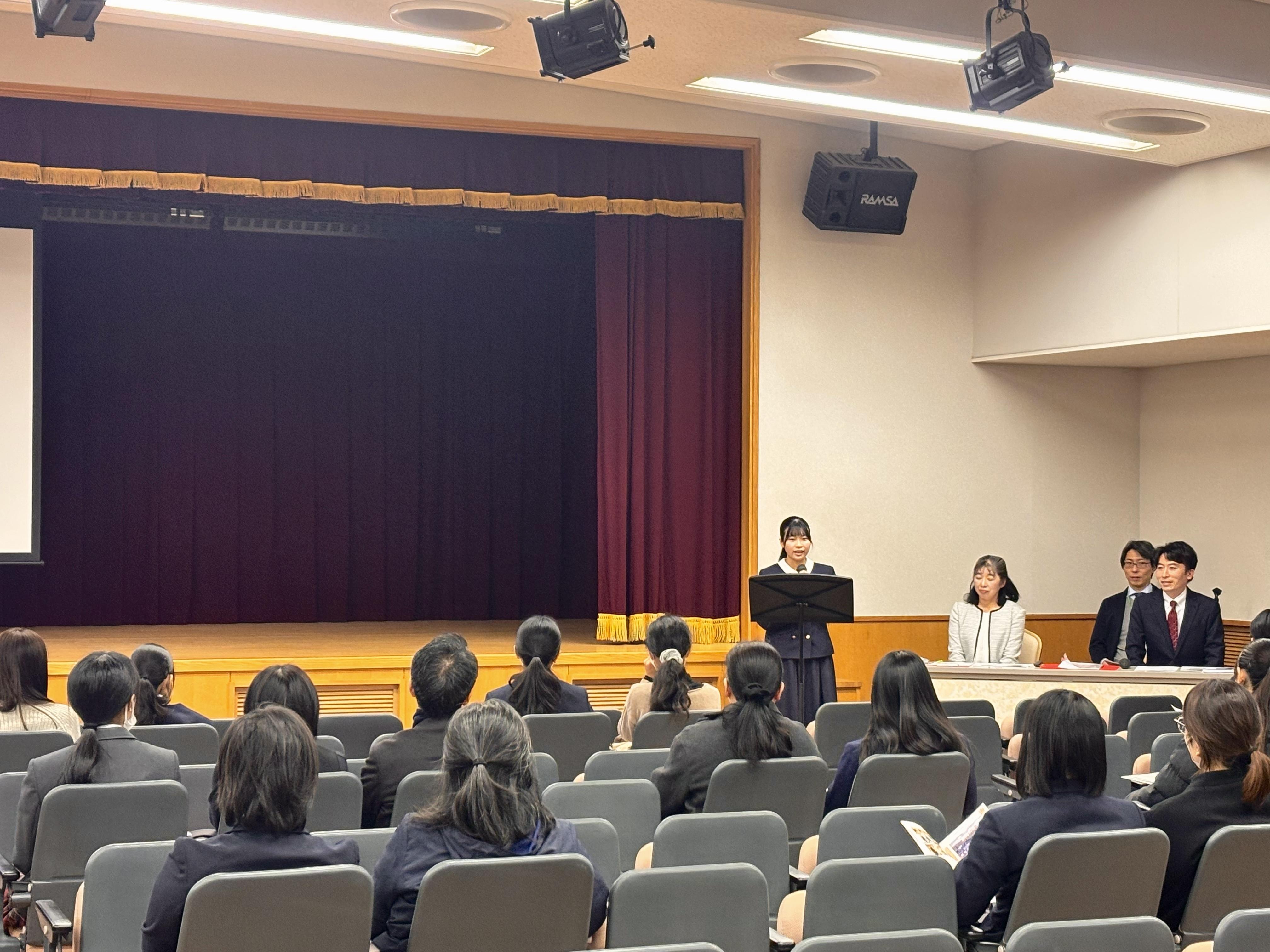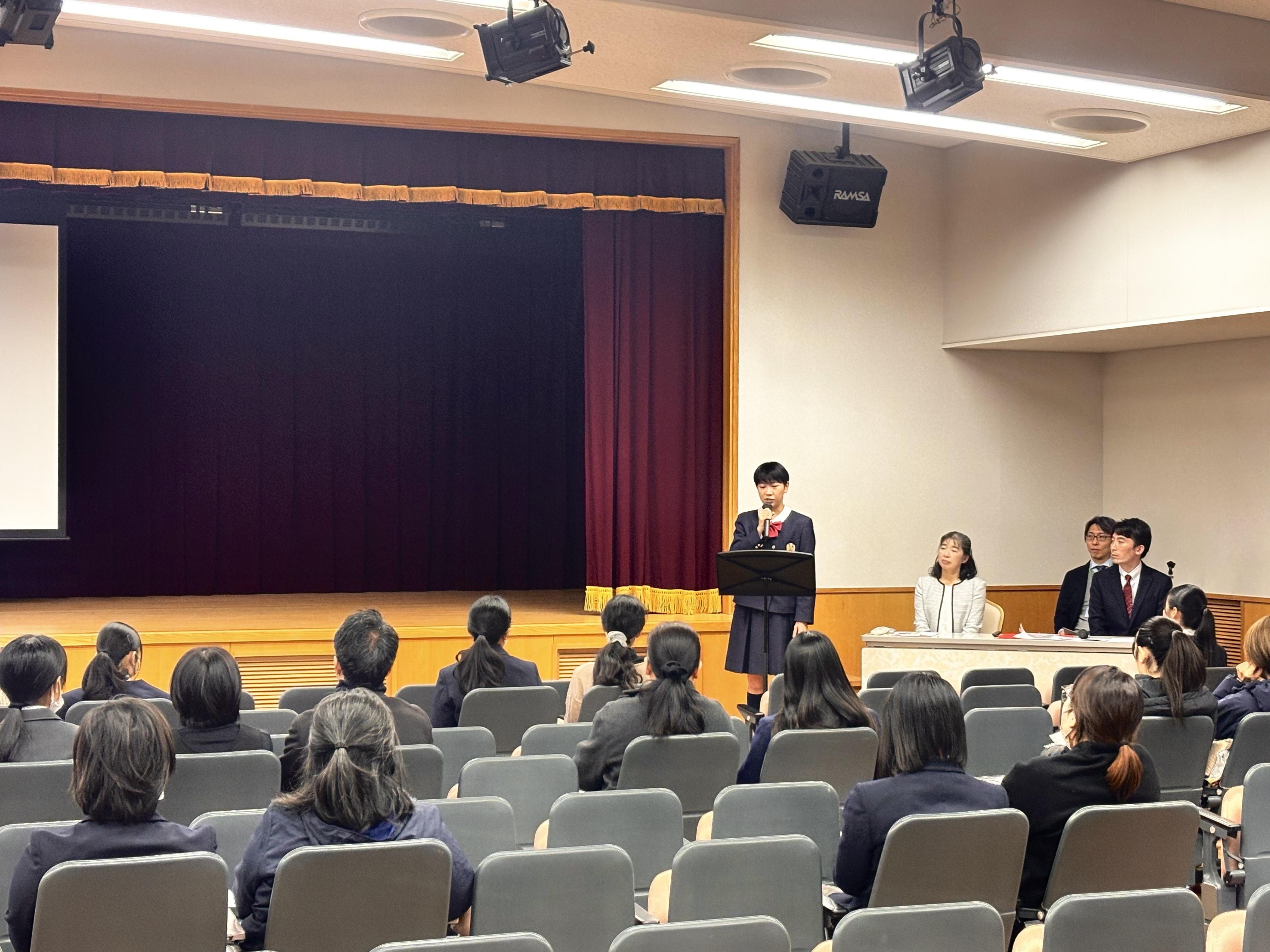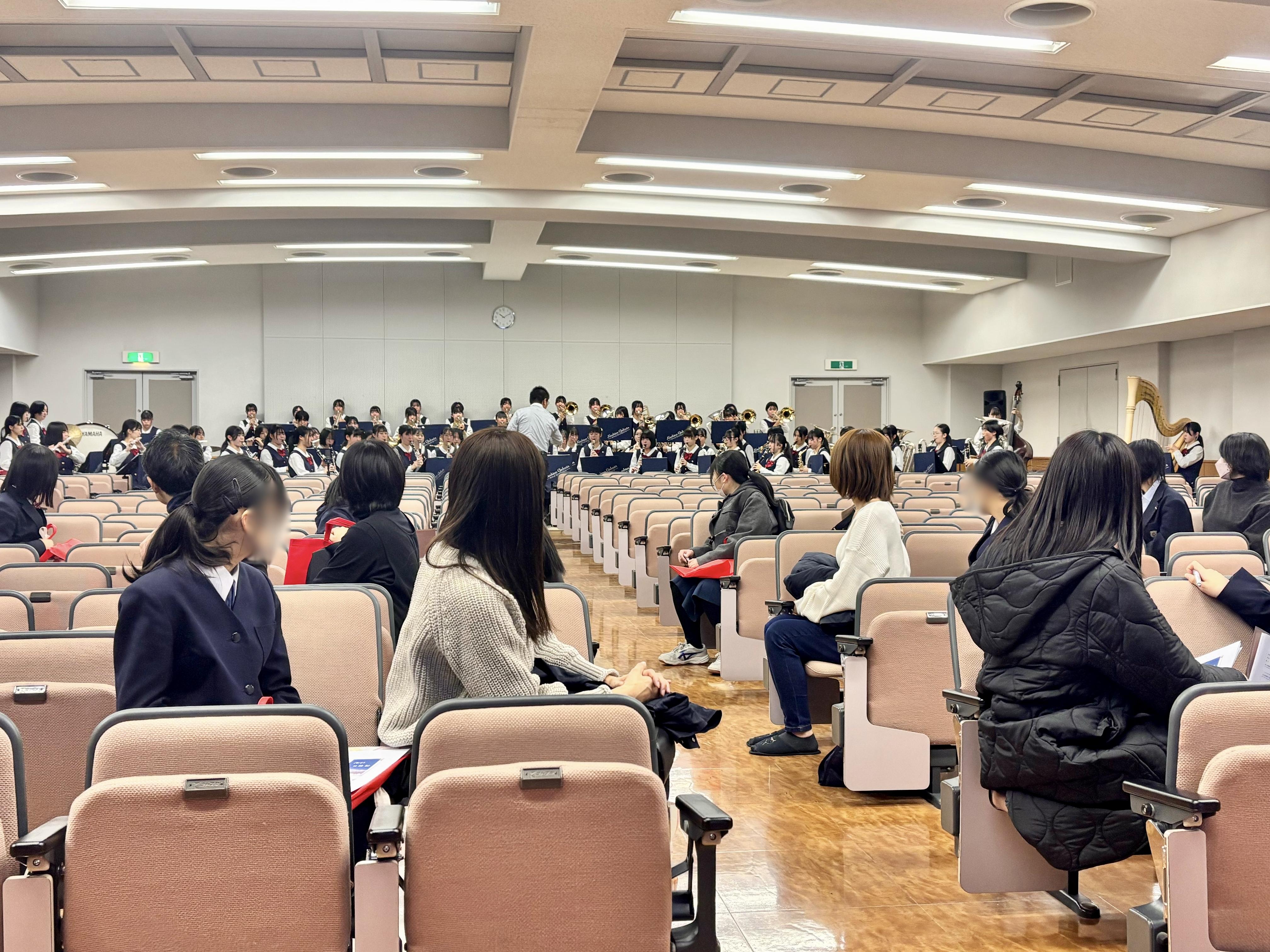 吹奏楽部による歓迎演奏で全体説明会がスタートし、本校の特色、コース説明、在校生のスピーチならびに入学試験概要の説明を行いました。