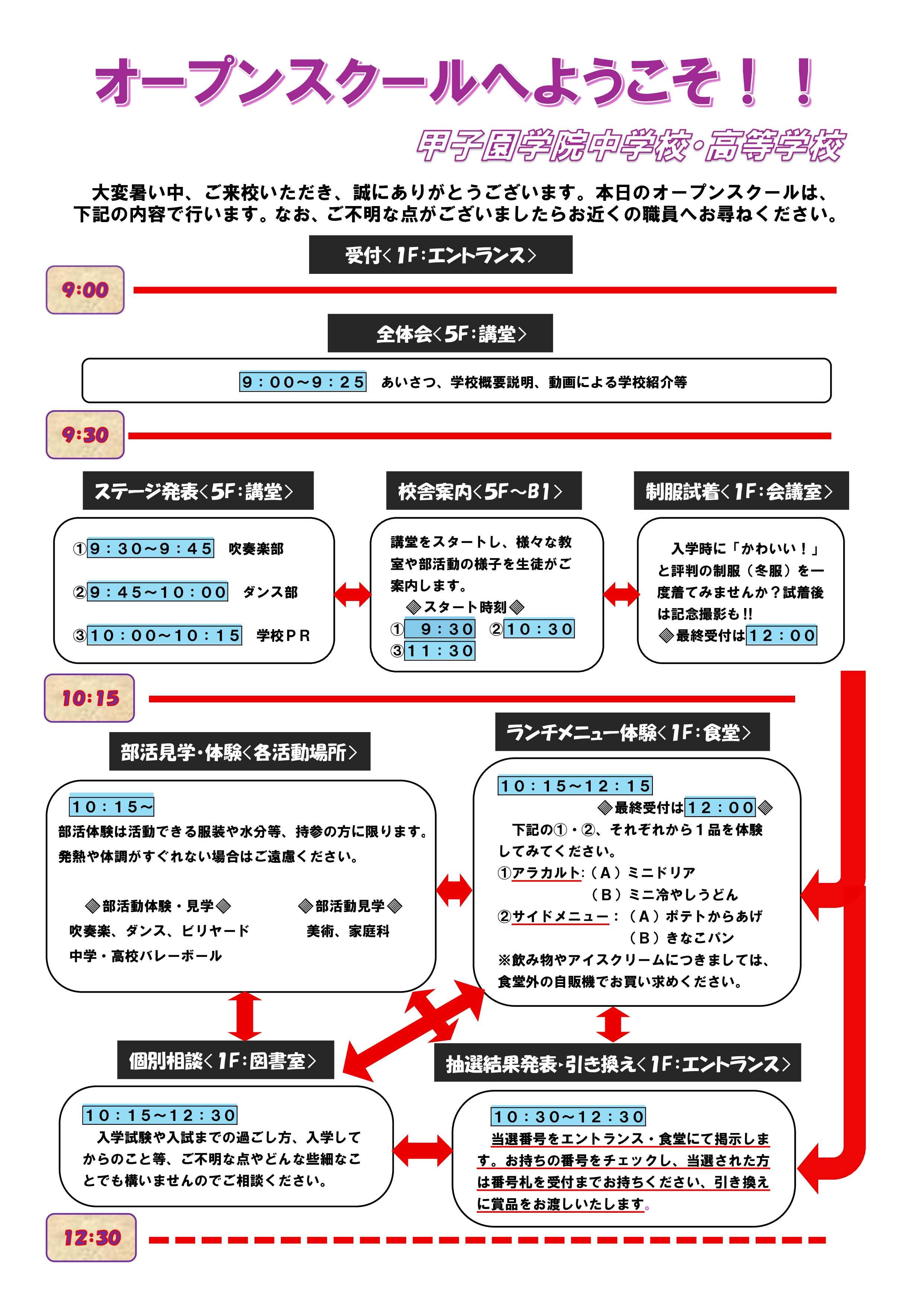 本校の雰囲気や生徒の様子など、直接受験生の皆様の目で耳で身体で感じていただけるイベントです。今年はまず、全体会を開催し、学校の概要をお伝えした後、部活動や生徒会を中心としたステージ発表や校舎案内等を行い、その後、部活動体験・見学やランチメニュー体験、制服試着体験、個別相談、そして、参加者の中から抽選で…など盛りだくさんの企画で皆さんをお待ちしています。