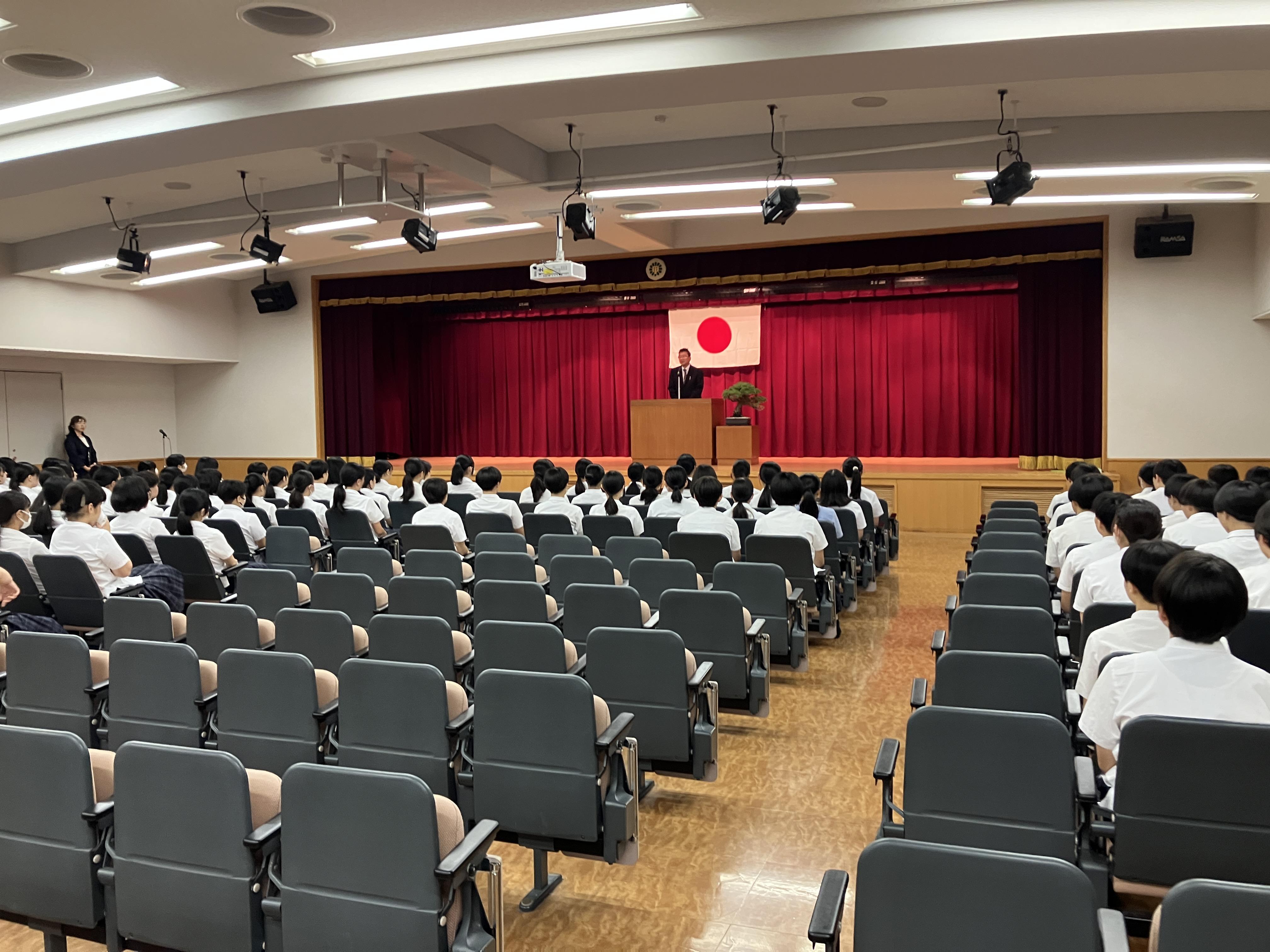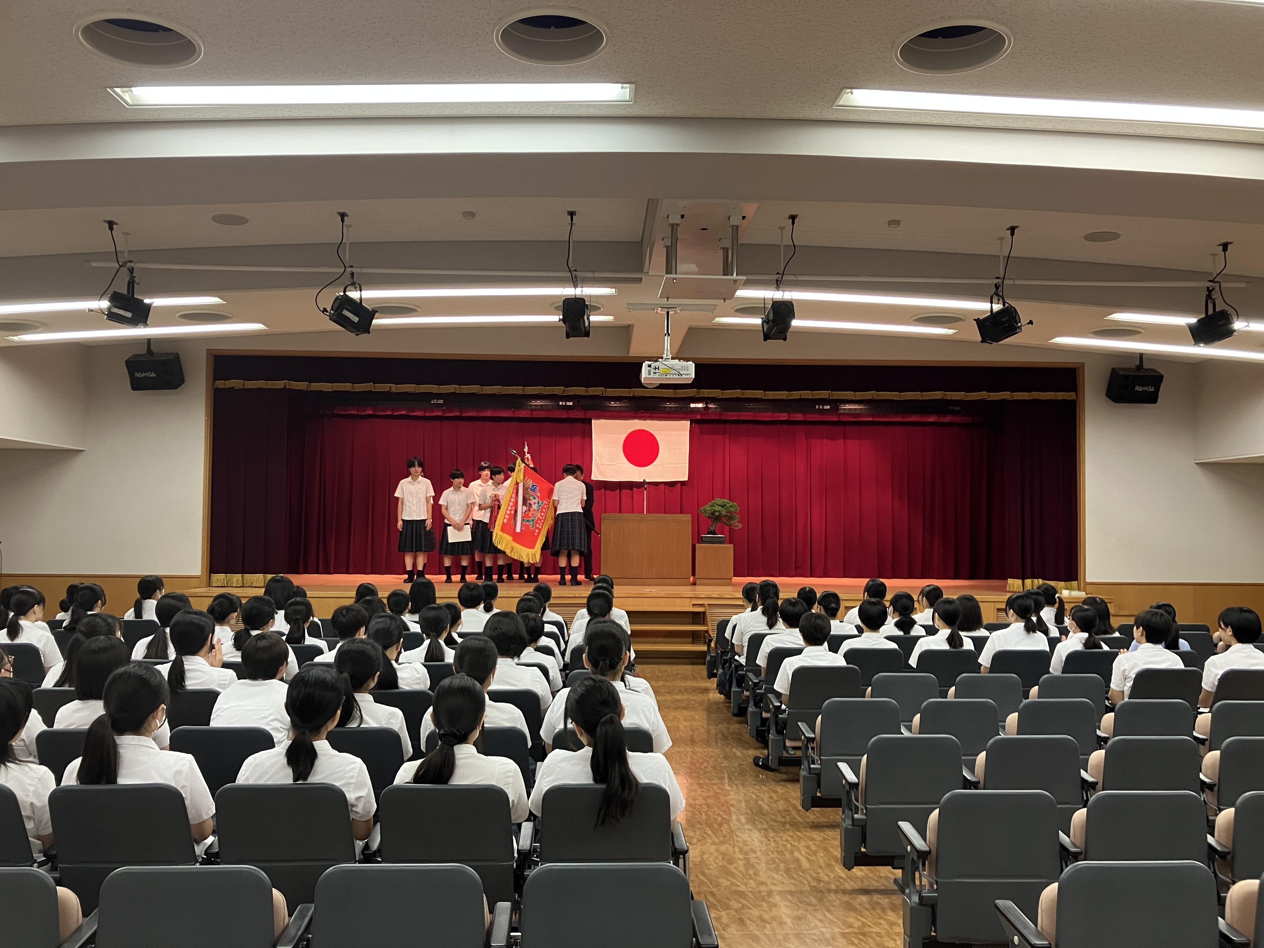 終業式では宮島校長先生からのお話を聞き、吹奏楽部の演奏による国歌ならびに学院歌斉唱を行いました。