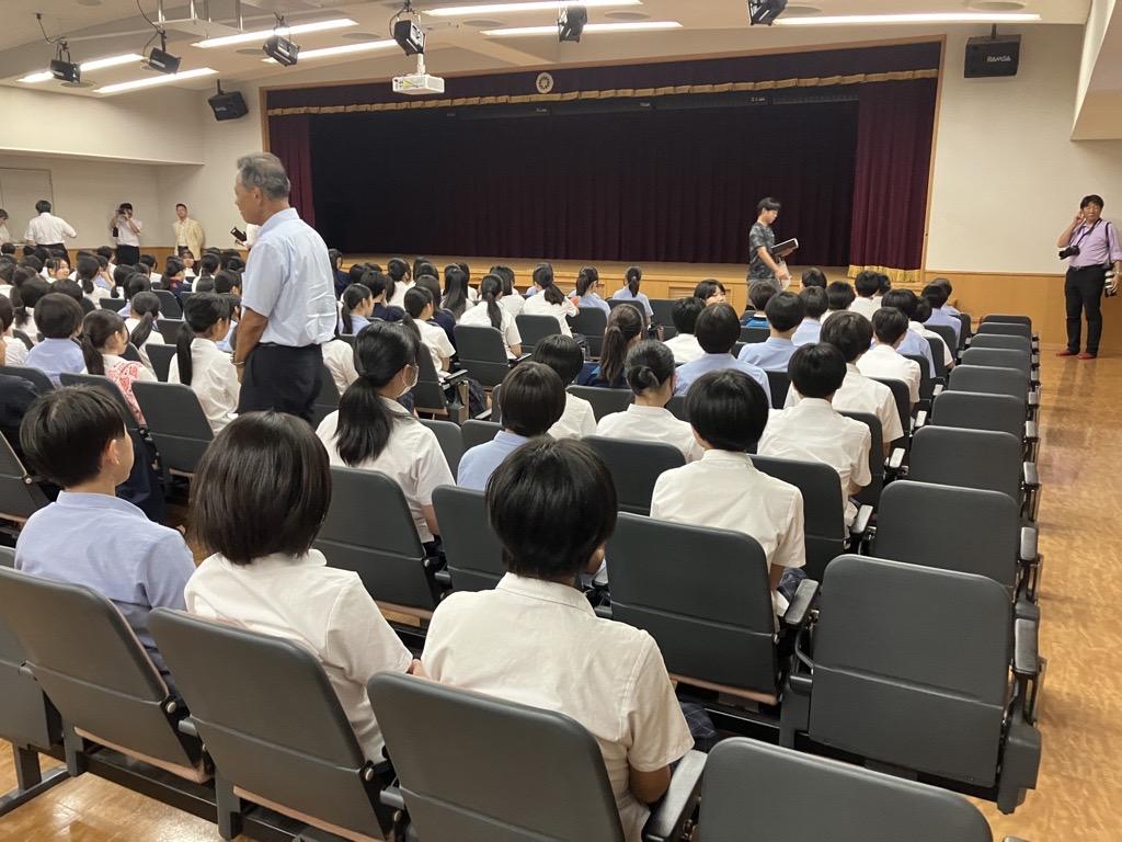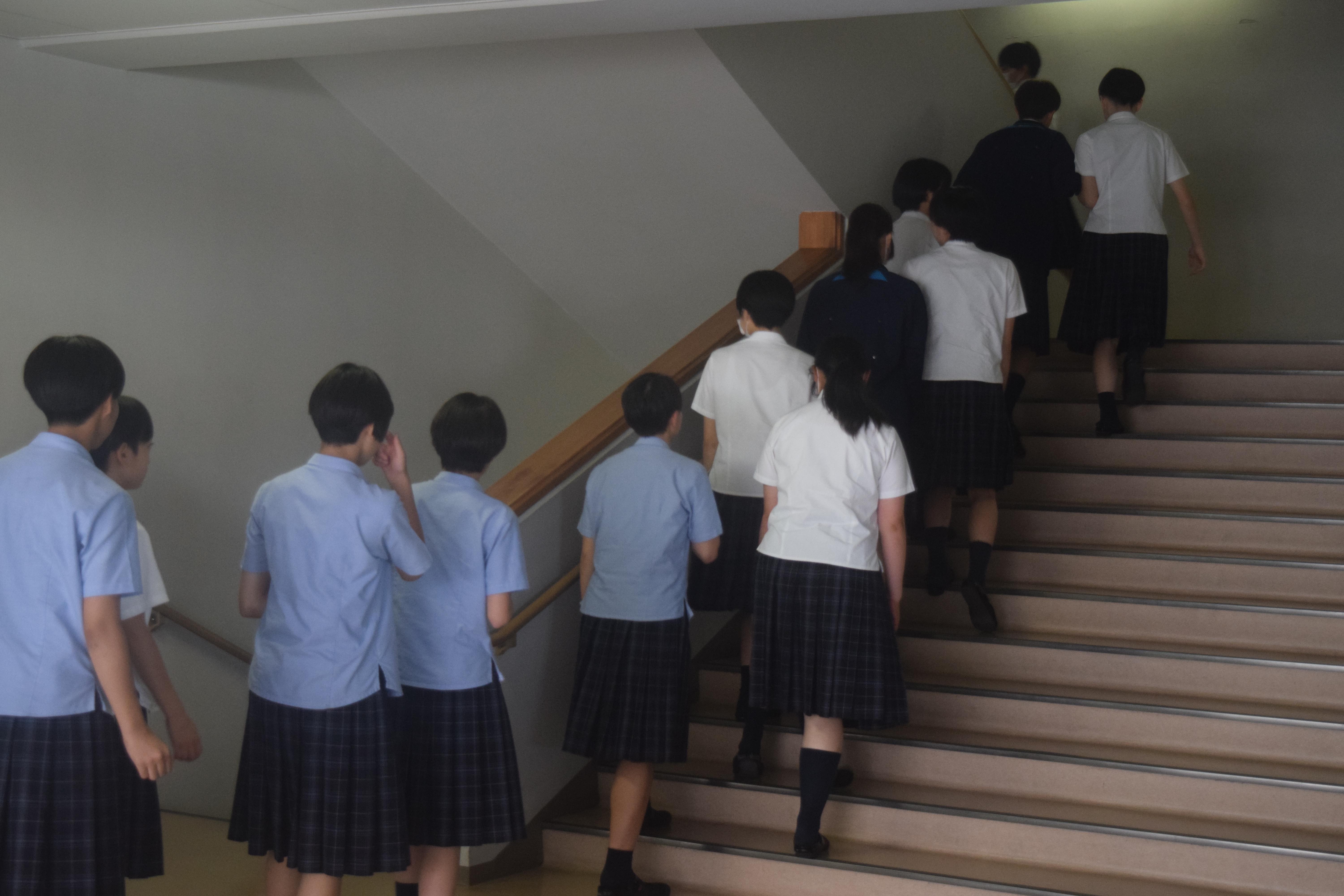 今回は台風接近による武庫川河川敷の氾濫を想定したもので、全員指定された場所へ避難するよう放送後、全校生徒は速やかに避難し、宮島校長先生から「訓練の段階からしっかりとした行動と備えをしておきましょう」との講評がありました。