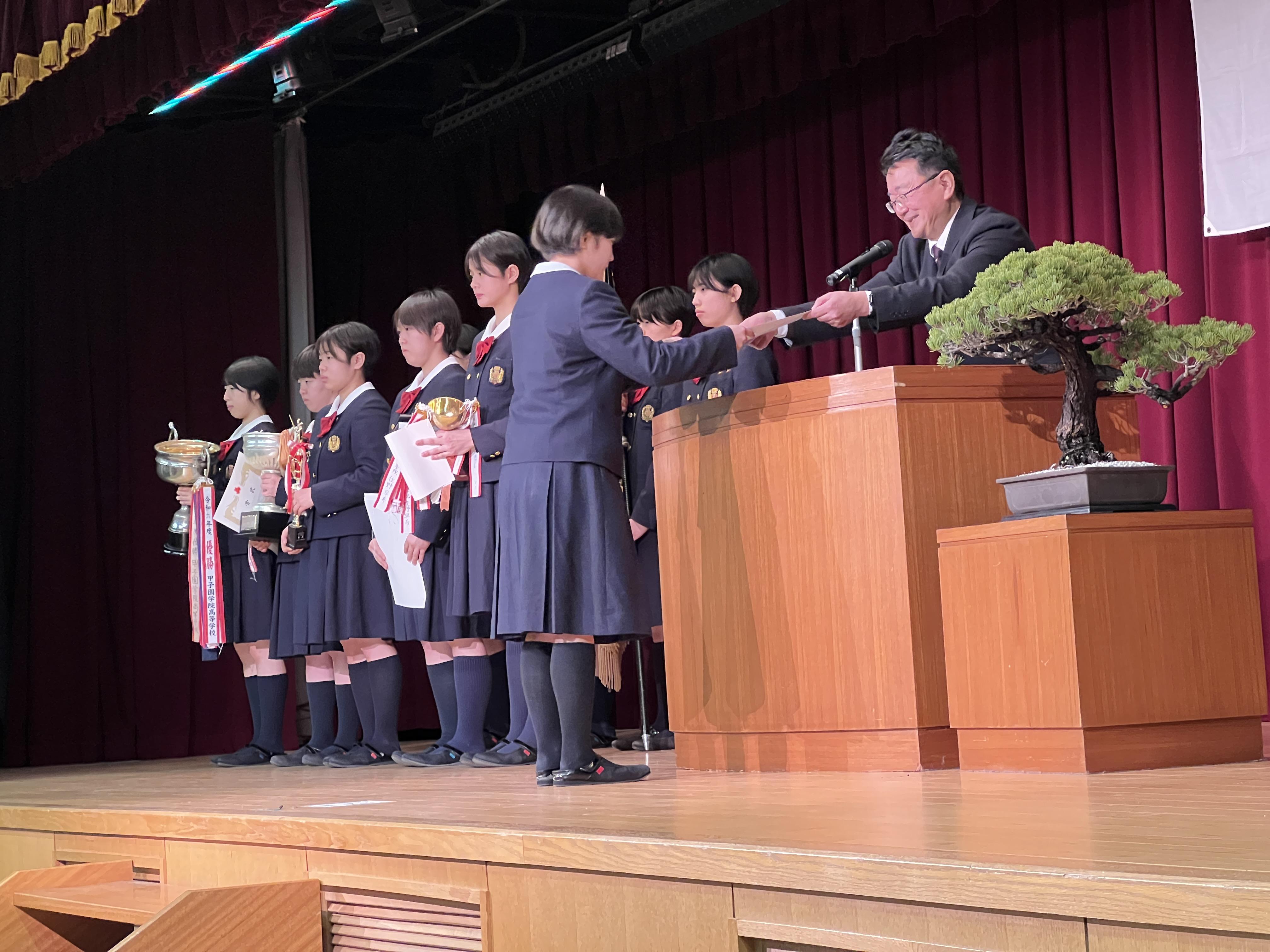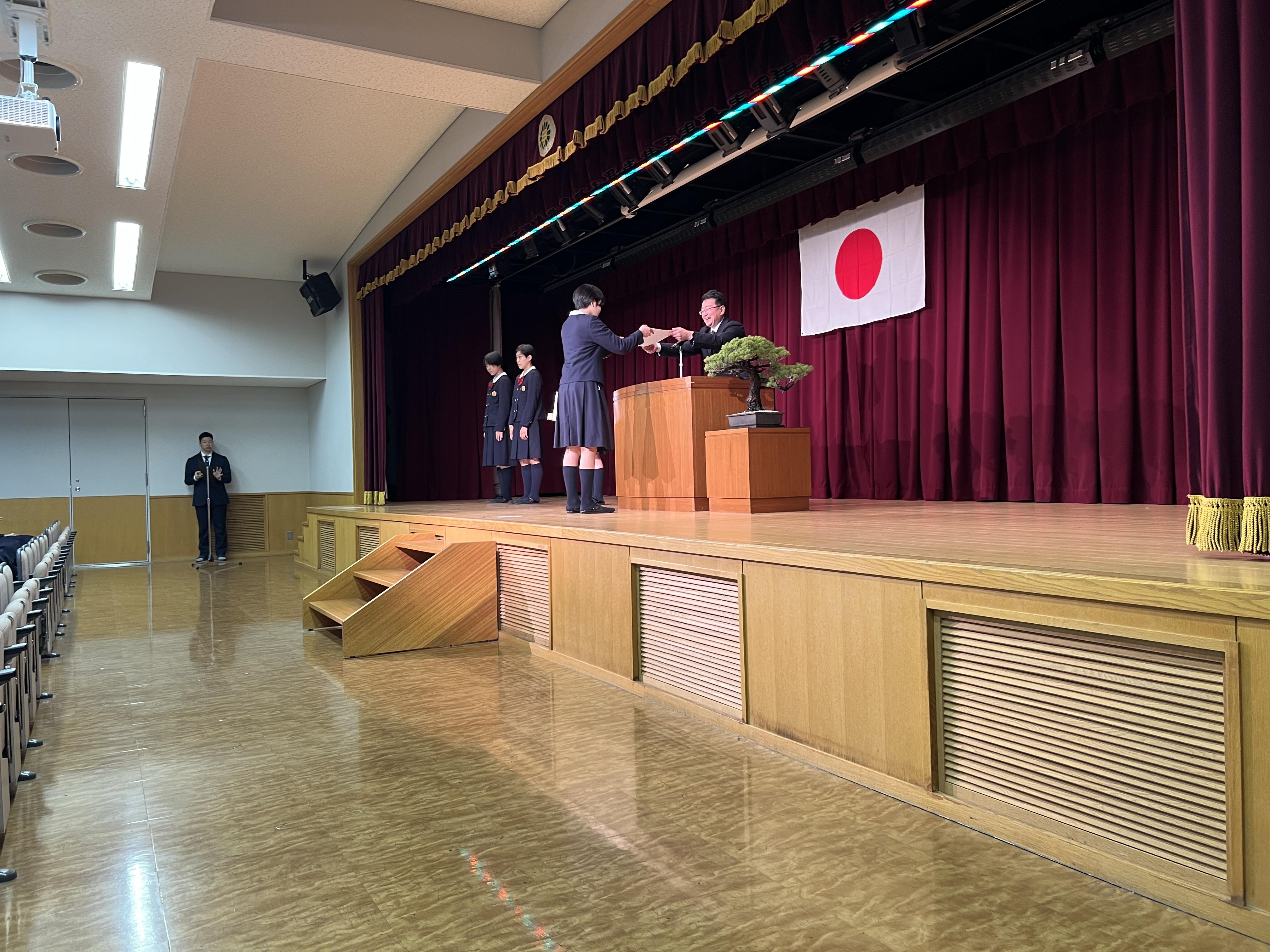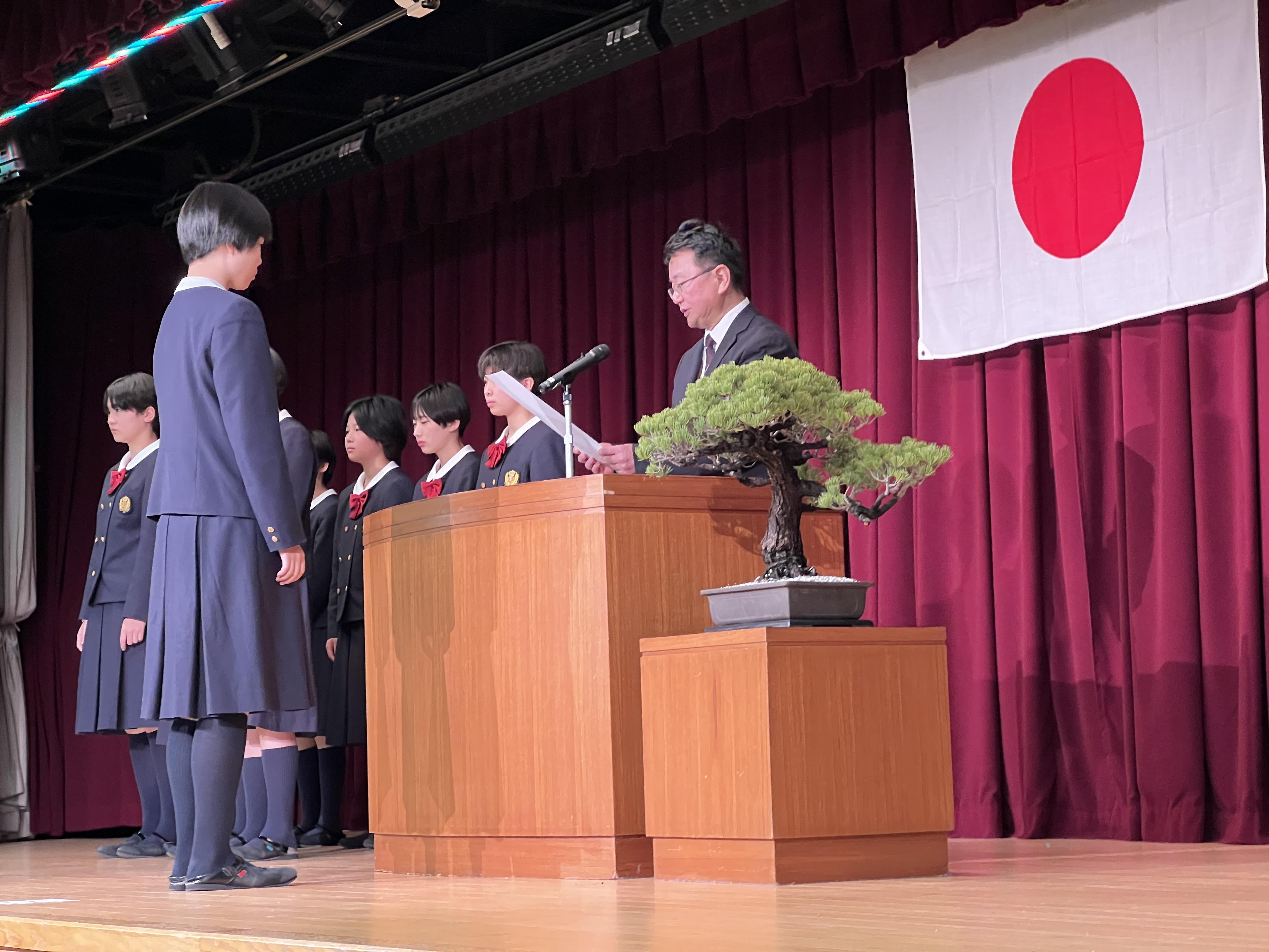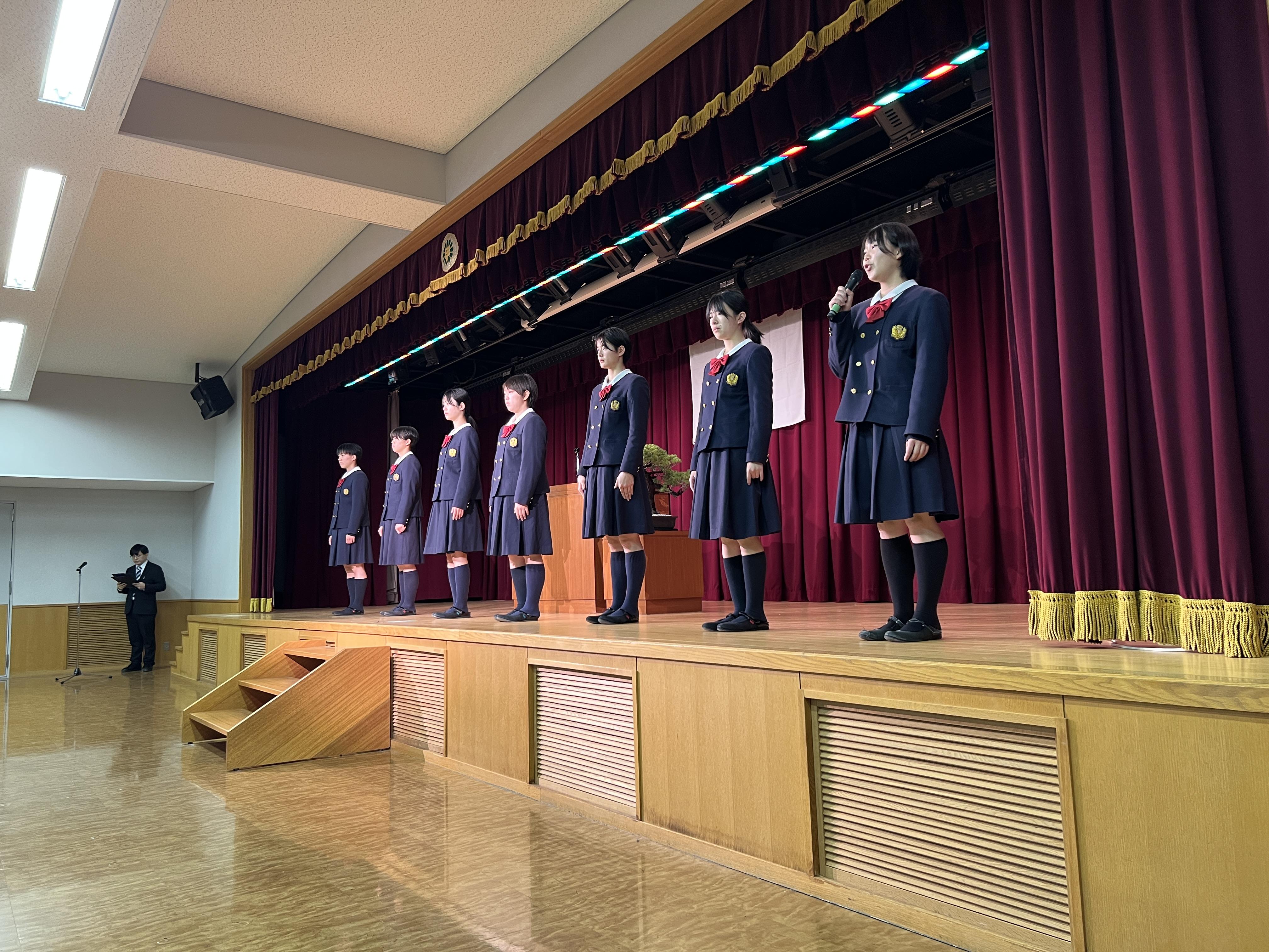 その後、私学の書展や各部活動などで活躍した生徒たちの表彰があり、令和7年度旧生徒会役員からの挨拶ならびに新生徒会役員候補者の紹介も行いました。